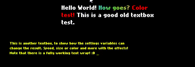 This textbox allows for per-character effects such as (but not limited to) coloring text or making an animated rainbow. Those effects are enabled and disabled by in-text code sequences that are small and human-writable.